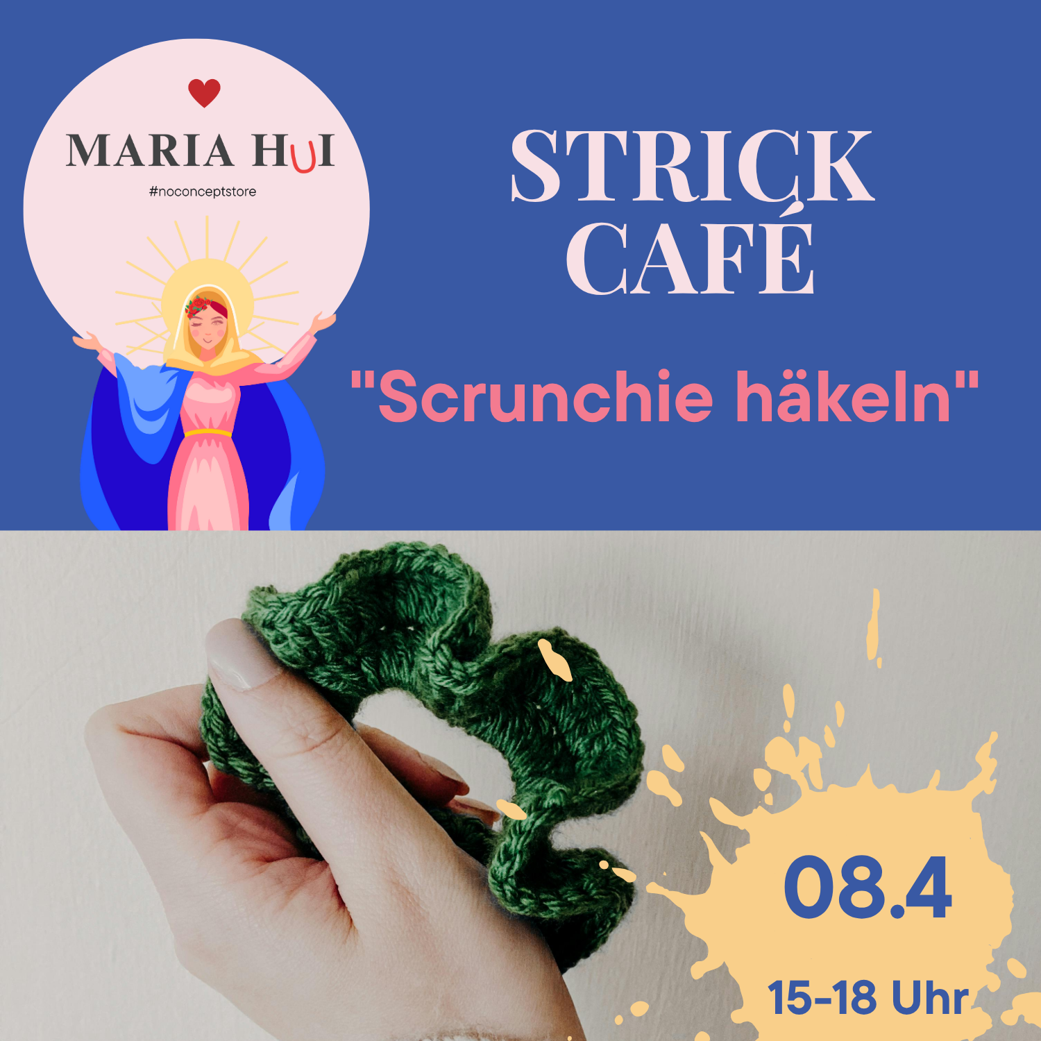 Special Strickcafé am 8. April 2026 – wir häkeln einen Scrunchie! Ab 15 Uhr treffen wir uns im DIY-Café und starten gemeinsam das Projekt Scrunchie – ein selbstgehäkelter Haargummi. Mitbringen: Häkelnadel Passendes Garn, am besten Baumwolle Das Special Strickcafé kostet nichts – Getränke, Kaffee und Süßes können gerne bestellt werden. Genieße eine kreative Auszeit, netten…
